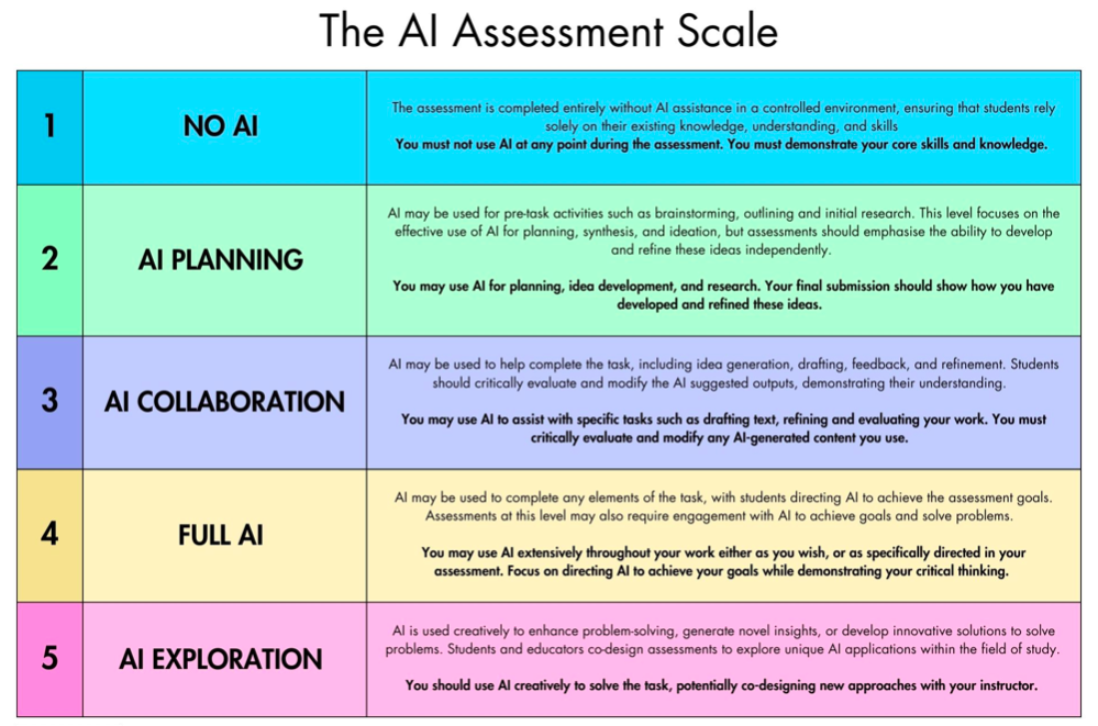 This week, we joined a webinar on the AI Assessment Scale led by Dr. Mike Perkins. This scale works on a couple of assumptions: AI detection tools are faulty and students need to be using AI to ready themselves for the job market. The assessment scale aims to square these two assumptions with the maintenance of ethics and integrity by setting work on a scale of AI integration in a piece of work.